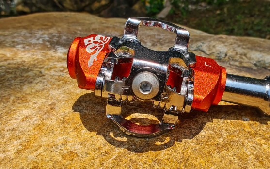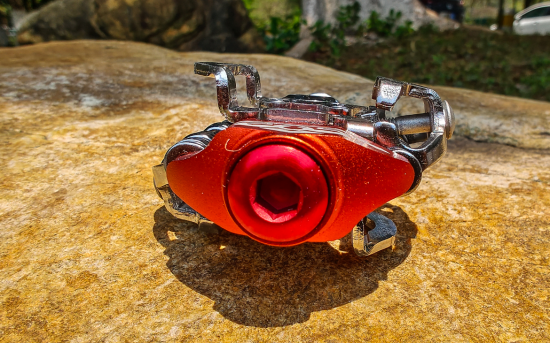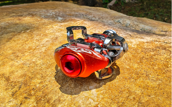 軸心通過一枚陽極紅的大螺絲固定,通過內六角拆裝,簡化了保養流程。軸心使用正反牙設計,防止螺絲隨著踩踏松脫。