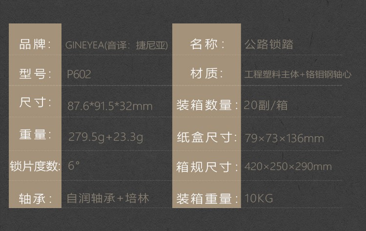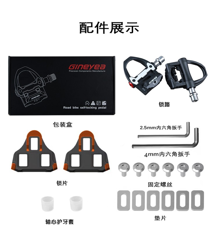 產(chǎn)品描述:品牌:GINEYEA(捷尼亞) 型號:P602 品號:13010426 品名:公路車鎖踏PRO(附鎖片6°)黑色執(zhí)行標(biāo)準(zhǔn):ISO4210 工藝:本體及扣片注塑成型材質(zhì):本體及扣片為工程塑料 軸心為鉻鉬鋼 顏色: 黑色/紅色/淺藍(lán)/橙色#公路車專業(yè)自鎖鎖踏,適用SPD-SL系統(tǒng),自帶鎖片體驗不一樣的騎行速度、穩(wěn)定、省力,踏板流線型一體化設(shè)計,高強(qiáng)度質(zhì)量輕的尼龍材料加持,一對鎖踏僅重約278g,鎖片重量約88g,松緊度可調(diào)節(jié)的張力設(shè)置,靈...